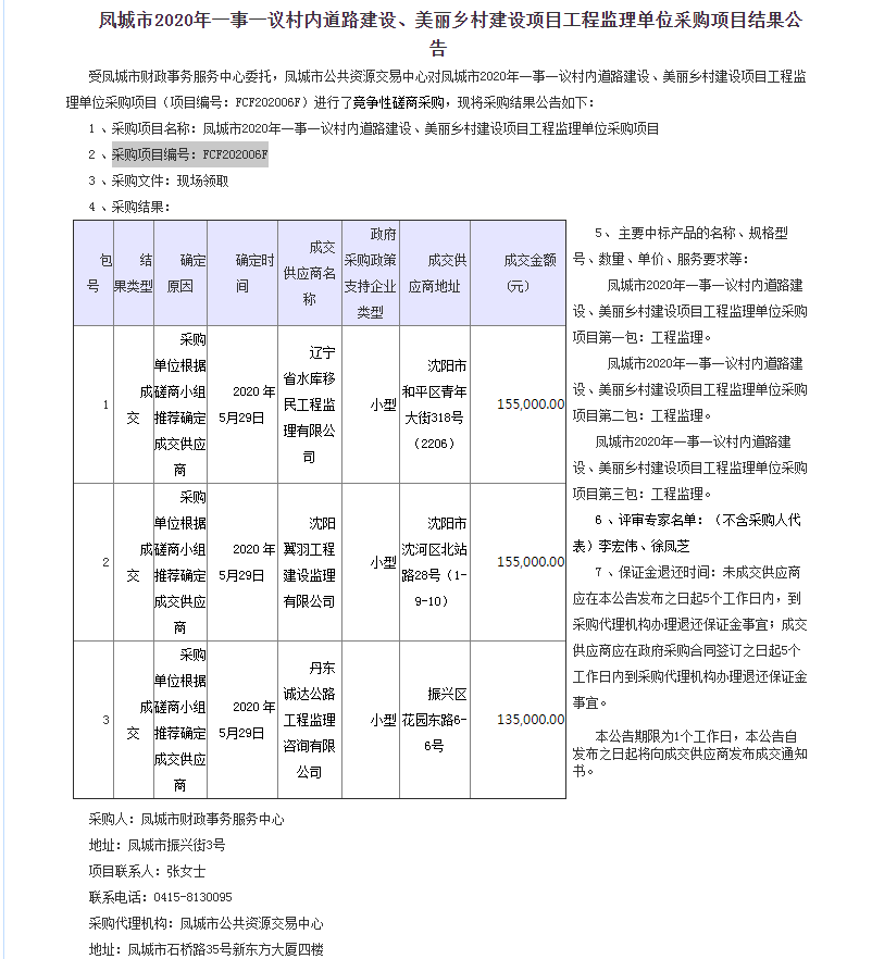 遼寧省水庫移民公司中標鳳城市2020年一事一議村內(nèi)道路建設、美麗鄉(xiāng)村建設項目工程監(jiān)理...