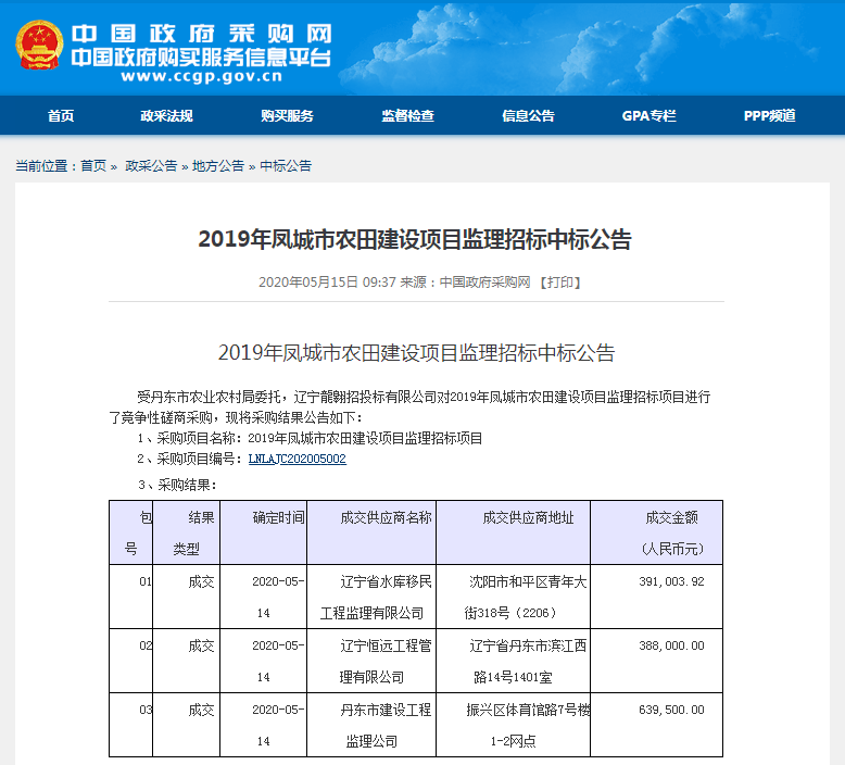 遼寧省水庫移民公司中標2019年鳳城市農(nóng)田建設項目監(jiān)理01包
