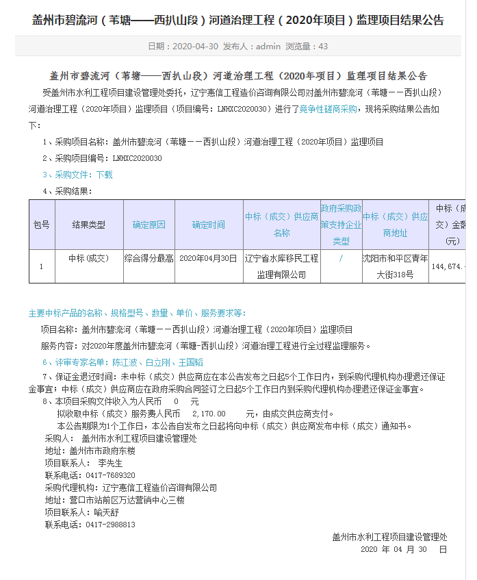 遼寧省水庫移民公司中標蓋州市碧流河(葦塘——西扒山段)河道治理工程(2020年項目)監(jiān)理...
